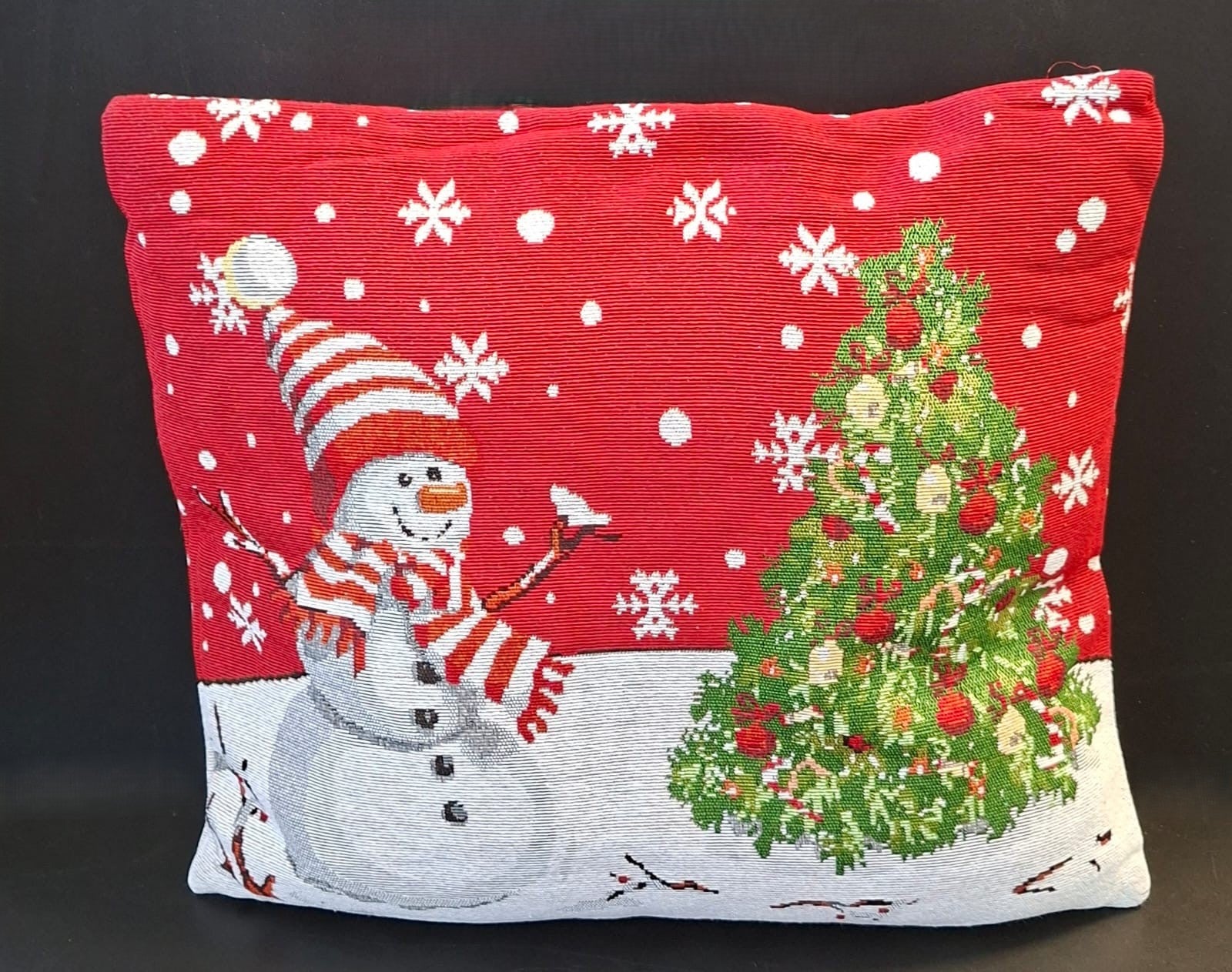 Pernă decorativă de Crăciun din material textil tip goblen, cu imprimeu vesel ce prezintă un om de zăpadă și un brad împodobit pe fundal roșu intens.