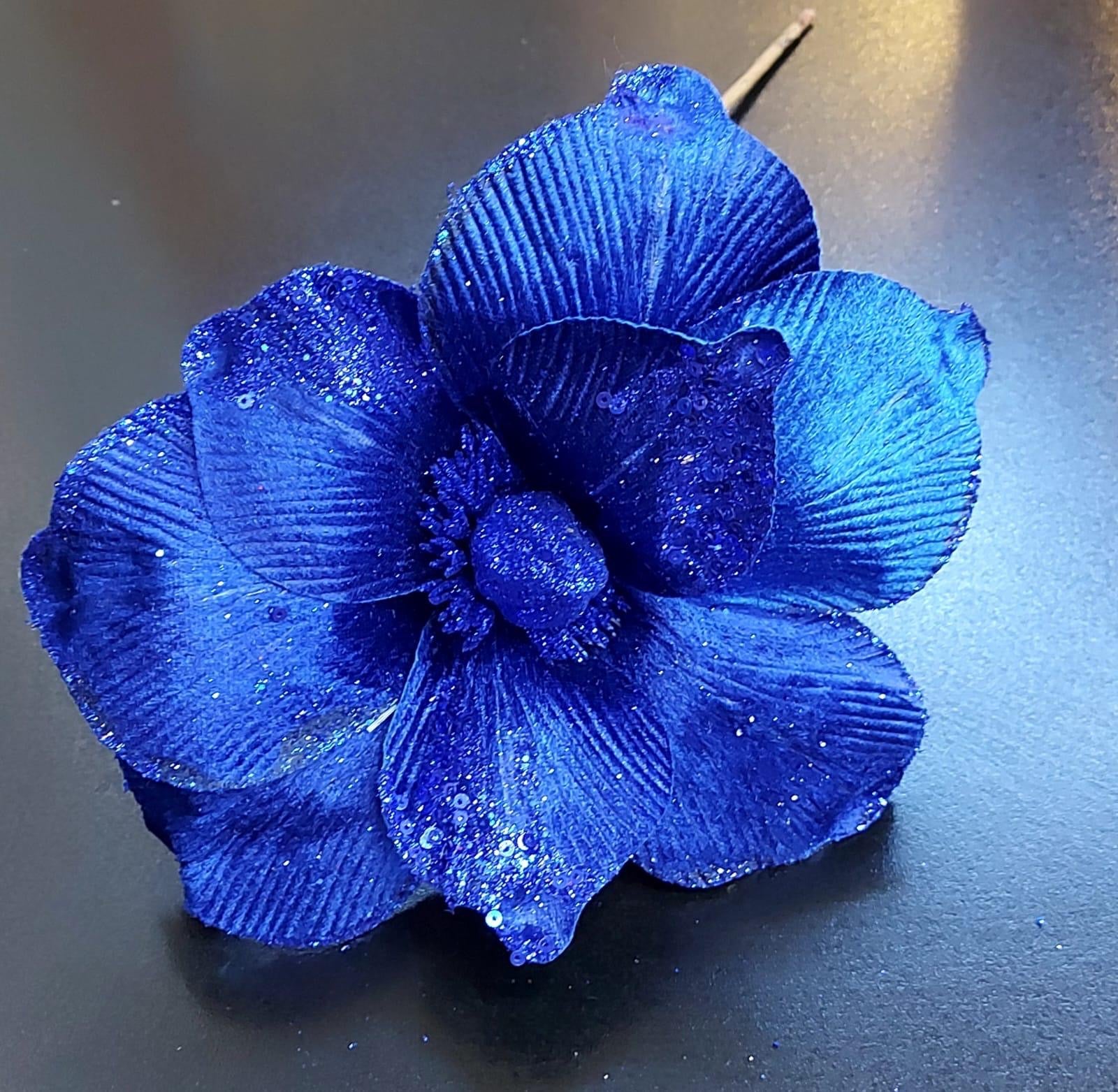 Adaugă un accent spectaculos bradului de Crăciun cu aceste flori decorative albastre royal. Realizate din material textil satinat și decorate manual cu paiete și sclipici albastru intens, oferă un efect elegant și modern în orice decor.