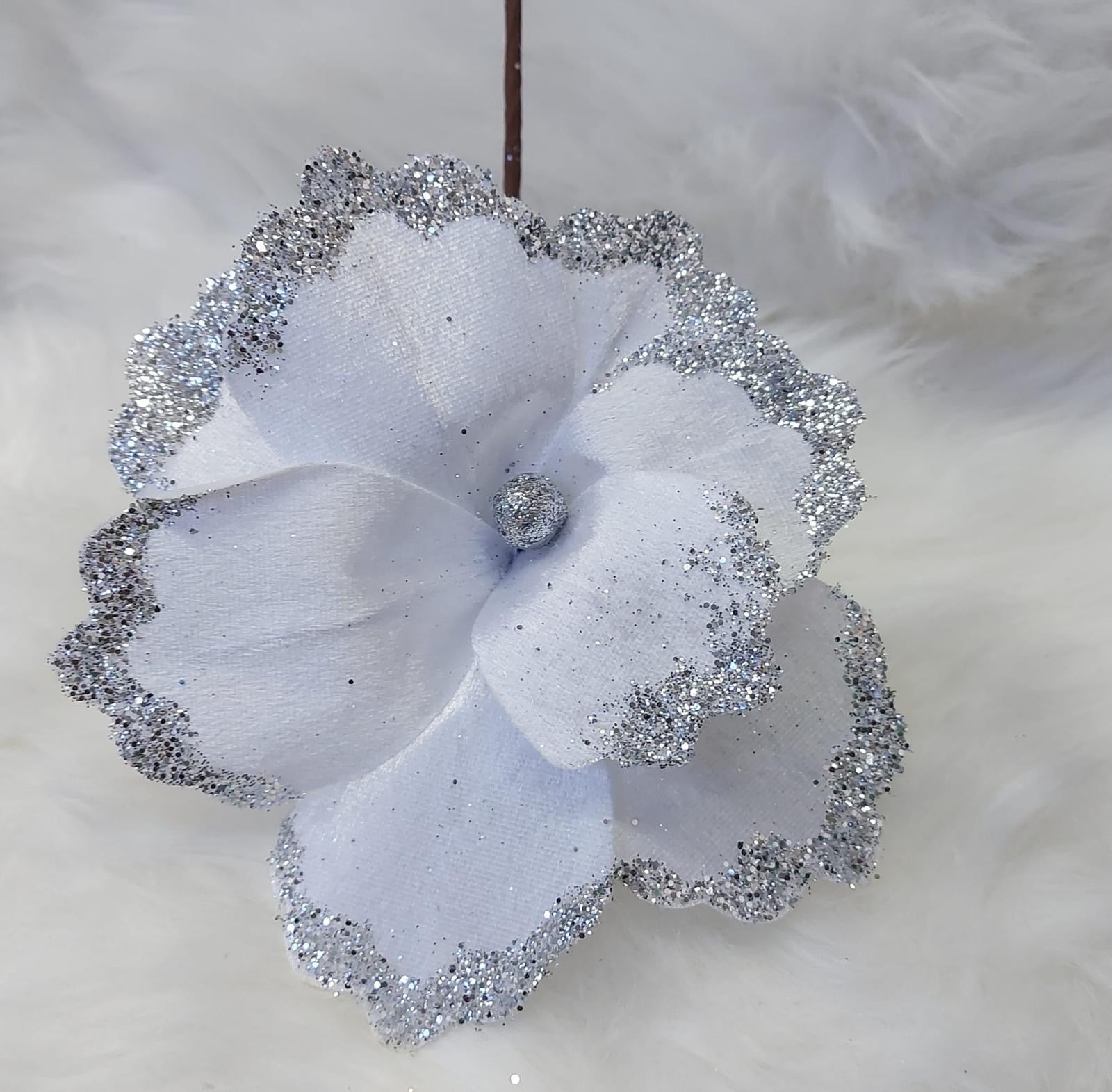 Completează decorul tău de iarnă cu aceste flori artificiale albe, decorate cu sclipici argintiu pe margini. Realizate din material textil fin, aceste flori adaugă luminozitate și eleganță bradului de Crăciun sau aranjamentelor festive.