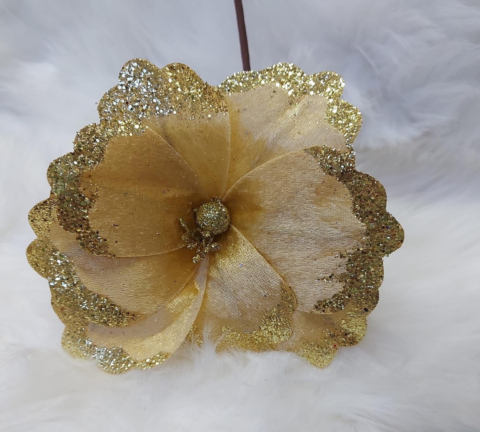 Adaugă un plus de strălucire decorului tău de sărbători cu aceste flori artificiale aurii de Crăciun. Realizate din material textil satinat, cu margine elegantă acoperită cu sclipici auriu, oferă un efect spectaculos și festiv.