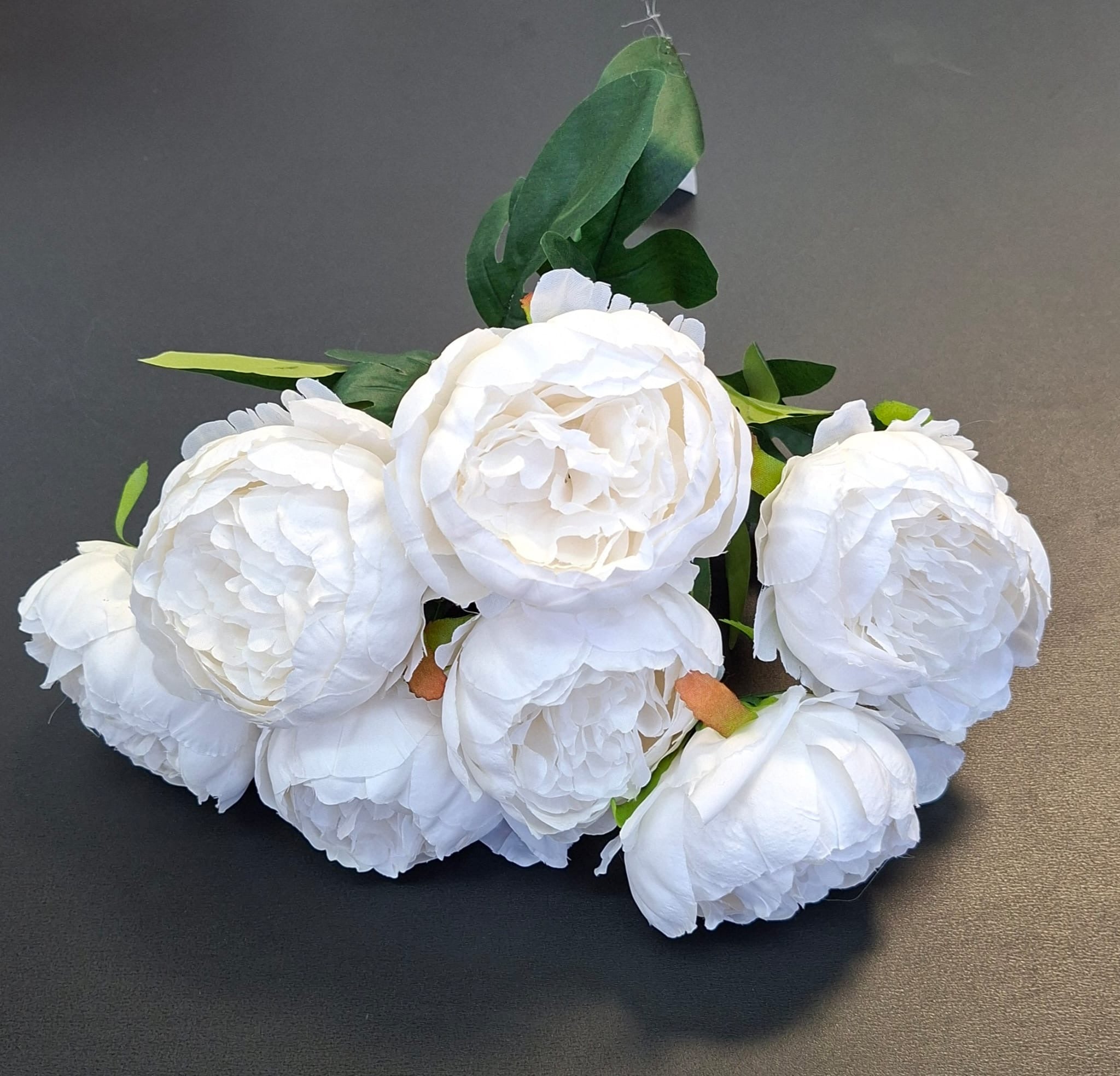 Simplu, dar de efect, acest buchet de bujori artificiali albi este alegerea ideală pentru decoruri sofisticate și atemporale. Cele 7 flori bogate, cu petale fine și perfect conturate, redau cu fidelitate frumusețea naturală a bujorilor. Frunzele verzi adaugă un contrast elegant, completând armonios buchetul. Potrivit pentru nunți, evenimente, decor minimalist sau cadouri rafinate.