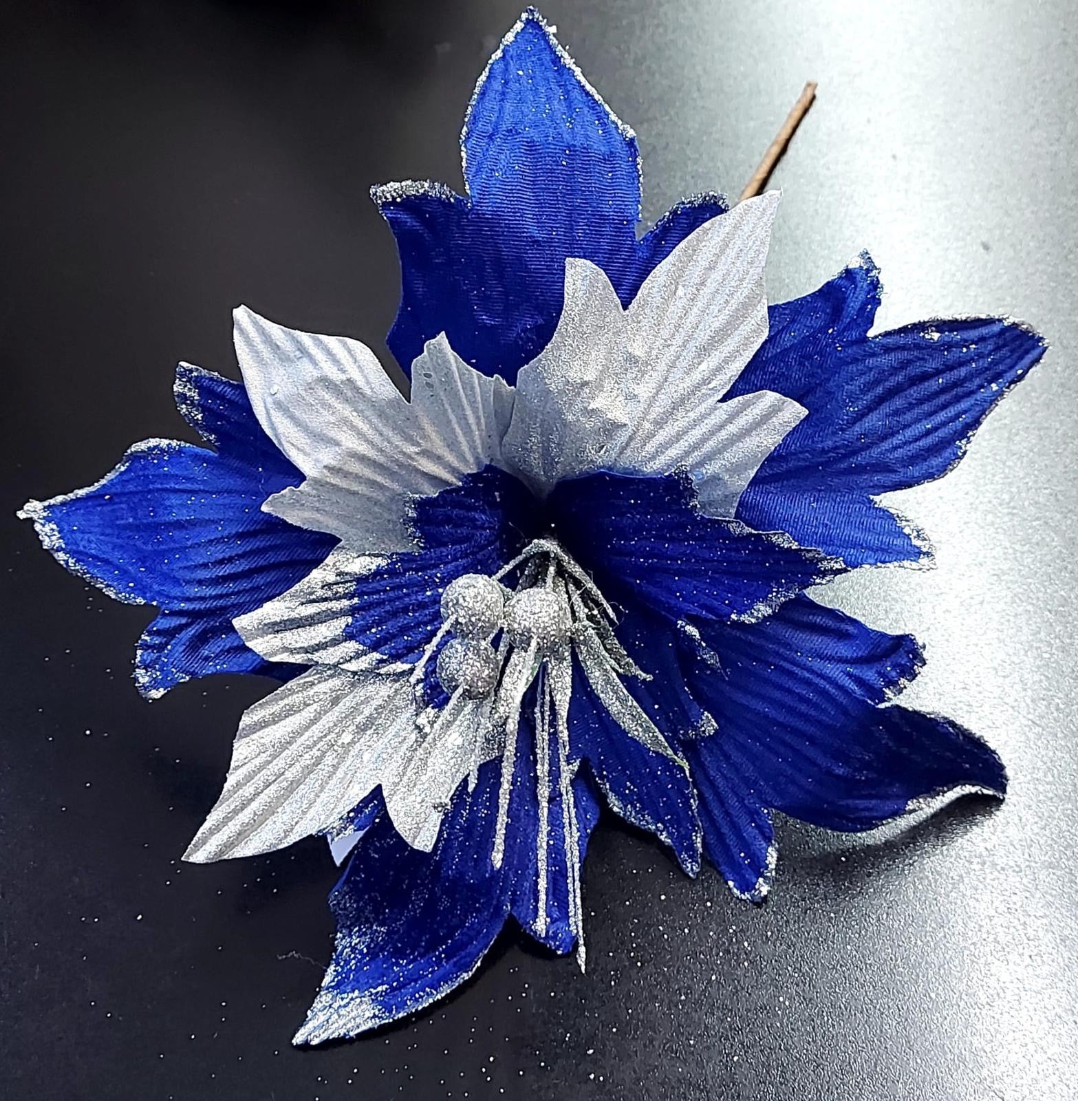 Adaugă un accent elegant bradului tău cu aceste flori decorative albastre și argintii. Realizate din material textil satinat, cu detalii fine de sclipici argintiu, aceste flori aduc un efect spectaculos și luminos în orice decor de Crăciun.