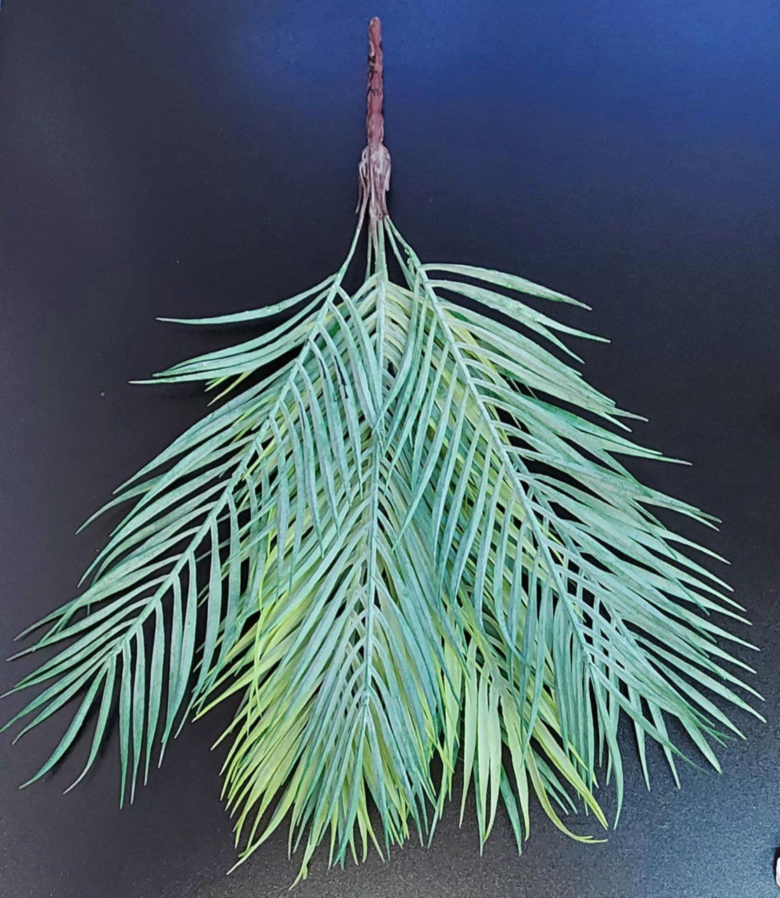 Ramură artificială decorativă cu frunze lungi, subțiri și dese, inspirate de palmierii tropicali. Tonurile blânde de verde pastel oferă un aspect natural și elegant, ideal pentru amenajări cu tematică exotică sau urban-jungle.