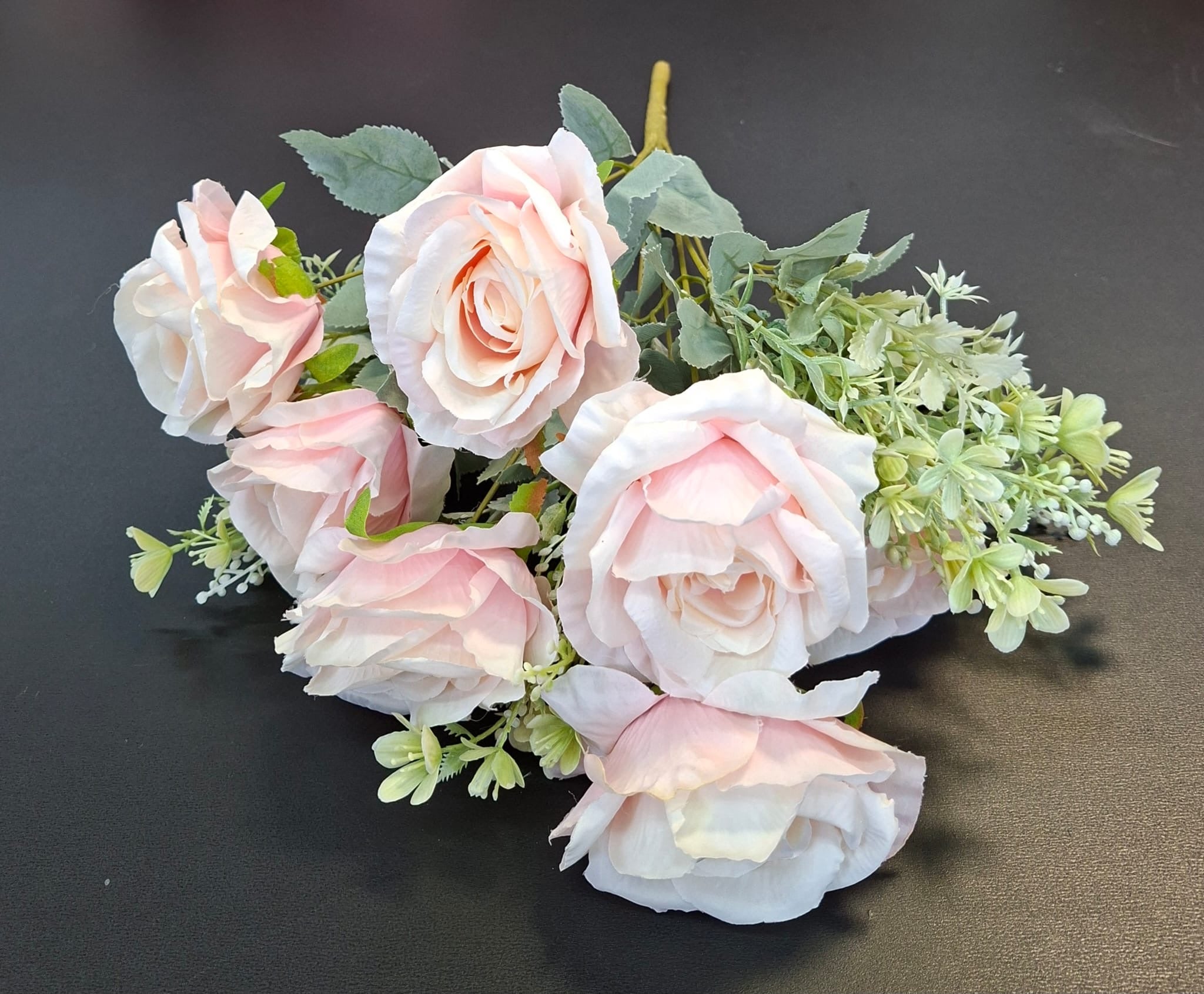 Buchet artificial format din 7 trandafiri roz pal cu flori mari și deschidere naturală, completat cu frunze verzi pastelate și flori decorative mici. Realizat din material textil de calitate, cu tije flexibile din sârmă pentru o adaptare ușoară în aranjamente florale diverse.